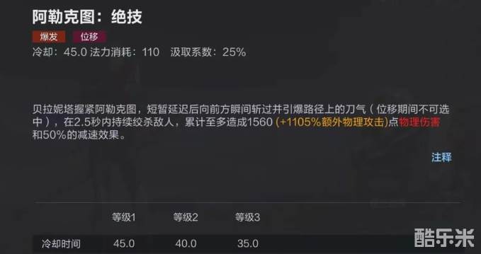 三技能在释放之后会有短暂延迟,然后向前方突进造成持续多次伤害,并将敌人减速,贝拉妮塔处于不可选中状态。技能加点上主要去加一技能,作为伤害输出来源,二技能辅助。在对线过程中的连招可以采用a312这样的方式来消耗敌人。先蓄力然后位移突进输出,然后再利用一技能去补伤害,二技能可以灵活穿插使用。
