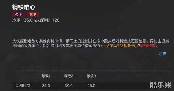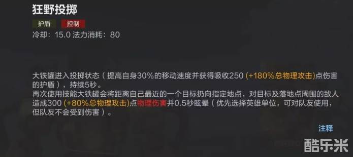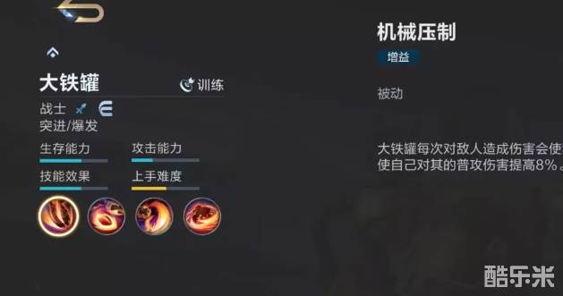 当大铁罐每次对敌人造成伤害时,都会提高对其的普通伤害。一技能随机对周围敌人释放,造成多段输出。二技能使其进入到投掷状态,获得移动速度加成和护盾,再次使用时将距离自己最近的英雄投掷到指定地点,并对落点范围内的敌人造成范围伤害。三技能使用后开启加速向敌人发起冲锋,造成伤害和眩晕并将周围敌人击退。