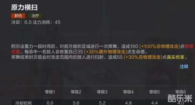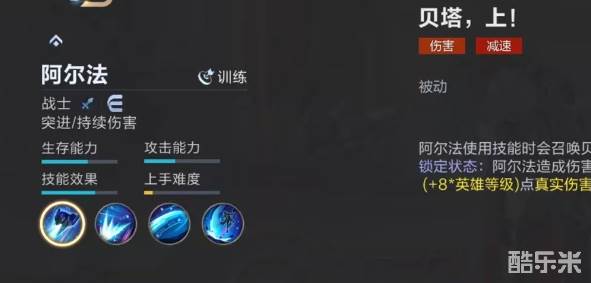 阿尔法这名角色非常擅长突进和造成持续伤害,是一名很强的战士角色。当他使用技能攻击目标时,同时会召唤出贝塔对目标造成多次伤害。一技能向前方发出斩击,造成伤害后将对方减速,二技能使用后会对前方扇形范围内造成伤害,进行一次挥舞,根据命中敌人数量来恢复自身生命值。此技能可以说是阿尔法的核心技能,尤其是在团战过程中,只要能找好角度命中对方2~3名英雄,依靠回复量就很难被击杀。
