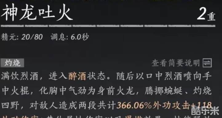 神龙吐火命中目标后,会有个爆燃效果,0.5秒内造成一次伤害,这伤害算作攻击判定。九曲的Q技能就是用来衔接的。