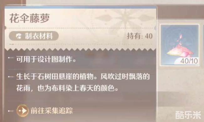 无限暖暖花伞藤萝是制衣材料,可用于设计图制作。生长于石树田悬崖的植物。风吹过时飘落的花雨,也为布料染上春天的颜色。下面酷乐米小编给大家带来的《无限暖暖》花伞藤萝获取方法,感兴趣的小伙伴们一起来看看吧。