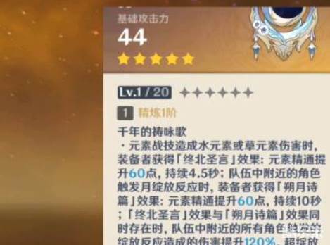 精炼一阶情况下纺夜天境特效为战技造成水伤或草伤时携带者能获得终北圣言效果,提升六十点元素精通,持续时间为四秒多,队伍中队友触发月绽放时获得朔月诗篇,提升持续十秒六十点元素精通。这两个效果同时存在时提升百分之一百二所有队友绽放反应造成的伤害,同时提升百分之八十超绽放和烈绽放反应造成的伤害。携带者在队伍后台时还是能触发这些效果,简单来说就是纺夜天境的特效触发条件是队伍中携带它的角色必须是水元素或者草元素角色。