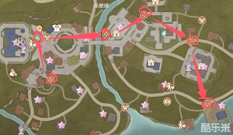 维修路灯需要玩一个通电路小游戏,修好一个路灯会赠送30钻,花愿镇一共6个路灯,能赚到180钻。具体路线如下图。