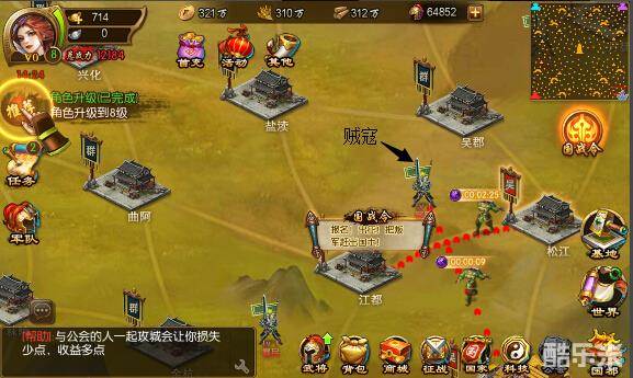 在《国战来了》世界地图中,常常会有贼寇流窜,扰民劫道,为了维护一方领土的安定,出兵剿匪势在必行!随着剿灭的匪徒实力越强,得到的回报也越丰厚哦!