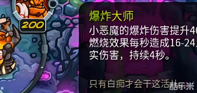 玩家在运用恶魔熔坑的时候,借助召唤小恶魔跟大恶魔,这样的话玩家就能够有效地拖延敌人的进度,而其他的防御塔就能够快速的输出,特别是玩家在战斗时,面对狭窄通道以及敌人这时候相对密集,频繁的使用恶魔熔坑之后,可以让灼烧跟爆炸伤害最大化。毕竟小恶魔的灼烧跟大恶魔的自曝,它能够同时击败多个敌人,再加上有真实伤害的加入,哪怕敌人面对的是高护甲的情况下,它的表现力度也是比较强悍的。