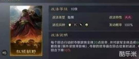 组合思路:【运筹帷幄】能够降低敌军两人四种基础属性,搭配【权倾朝野】再次夺取全体统率,降低敌军防御,打出高额伤害。