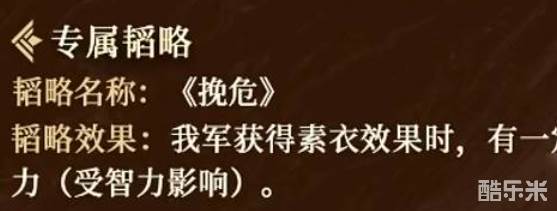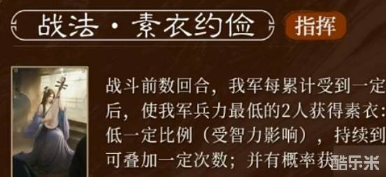 卞夫人的核心技能是“素衣约检”。该技能的机制较为独特,它要求在战斗的前几回合内,我方军队必须承受一定量的兵力伤害,才能激活“素衣”效果。这一效果会赋予我方兵力最脆弱的两名武将减伤效果,减少他们所受的伤害。减伤幅度与卞夫人的智力属性密切相关,因此,提升卞夫人的智力可以使得减伤效果更加显著。值得注意的是,这一减伤效果不仅能够叠加,还会持续到战斗结束,极大地提高了队伍的生存能力。下面和酷乐米小编一起来看看吧