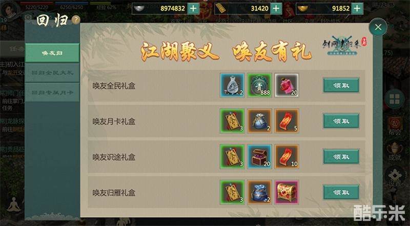 10月15日维护后-10月25日4:00期间, 回归的大侠除了可以免费领取一份【回归全民大礼】外,还可以领取【尊享回流礼盒】,更有全方位助力好礼、超高倍返利豪礼可供领取!而且,大侠每唤回一位符合回归条件的老友,即可获得一份【唤友全民礼盒】!所唤回的老友领取专享月卡/识途折扣礼/归雁折扣礼时,大侠还可获得相应的礼盒福利哦!
