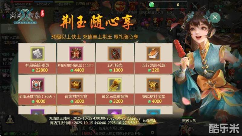 10月15日维护后-10月25日23:59期间,各位大侠可使用充值活动赠送的荆玉,在荆玉商店中兑换心仪的活动道具!商店中有神品秘籍残页、至臻马具宝箱、拜星月幔外装礼盒、背饰材料礼盒、黄金马具重随符、披风宝箱等多种好礼等你来兑换!