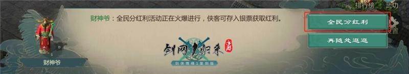 10月15日-10月25日期间,前住【襄阳】中心广场【财神爷】处,每人每天8:00-14:00存入400银票立即获得888金币。当天己入银票的大侠可在19:30-20:00期间预约领取银票,己预约的大侠可在20:10后领取存入的银票,同时末预约领取的大侠所存入的银票会作为红利均分给己预约的大侠。