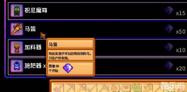 星露谷物语齐钻最优先兑换的是马笛,它能让你随时随地召唤马匹,大幅提升跑图效率。无论是前期开荒还是后期打理农场,节省时间比什么都重要。接下来可以考虑小镇钥匙,它能让你随时进入所有建筑,送礼或完成任务再也不用卡时间。这两个道具属于功能性刚需,兑换后游戏体验会顺畅很多。下面和酷乐米小编一起来看看吧
