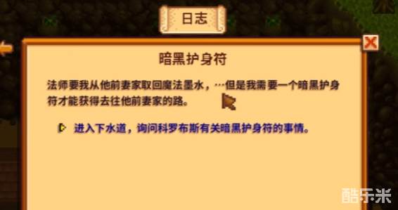 完成初始任务后,法师会要求玩家取得黑暗护符。该物品位于下水道最右侧房间的宝箱中,需要先向博物馆捐赠60件物品获得生锈钥匙才能进入下水道。建议携带银河剑等强力武器和生命药水应对战斗。取得黑暗护符后返回法师塔,法师会引导玩家进入塔内地下室,这里可以改变角色外貌并安装异界晶石兑换彩虹猫之刃等特殊物品。