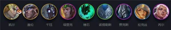 凯尔+盖伦+千钰+塔里克+锤石+诺提勒斯+贾克斯+拉克丝+芮尔