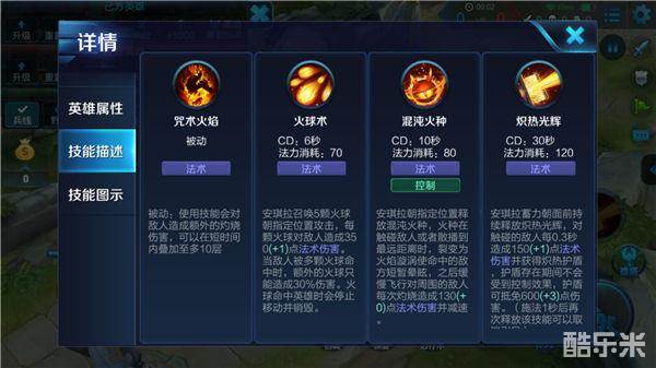 一技能-火球术:一技能能让安琪拉召唤火球对敌人造成攻击,往往是在大招使用之后没有收割敌人用来补刀,不过前期一技能也能够快速清理兵线。
