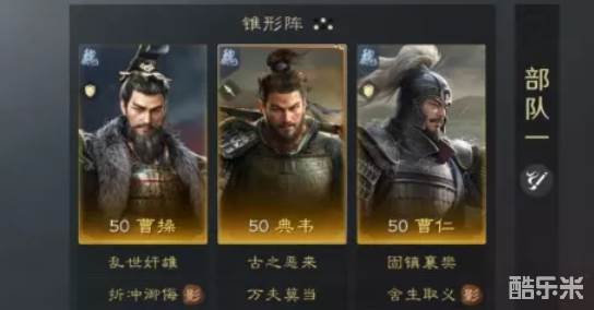 三国谋定天下演义武将的出现让很多体系发生变化,部分老武将也重获新生,这里分享一套演义曹仁、典韦、曹操组成的铁壁反击流,能够用来克制普攻突击队,下面和酷乐米小编一起来看看吧