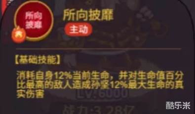 消耗当前12%的生命(注意,这里是当前生命的12%,不是最大生命的12%)。对敌方单体造成孙坚最大生命值12%(最大生命值越高,伤害倍率越高,最高可以增加15%,也就是12%+15%=27%)的真伤。