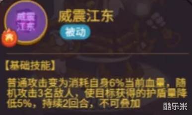 普攻是随机打3,消耗当前血量的6%,降低受攻击武将的护盾获得量10%,且是不可叠加的。所以这个技能只能说是中规中矩,减盾效果不如碎盾。