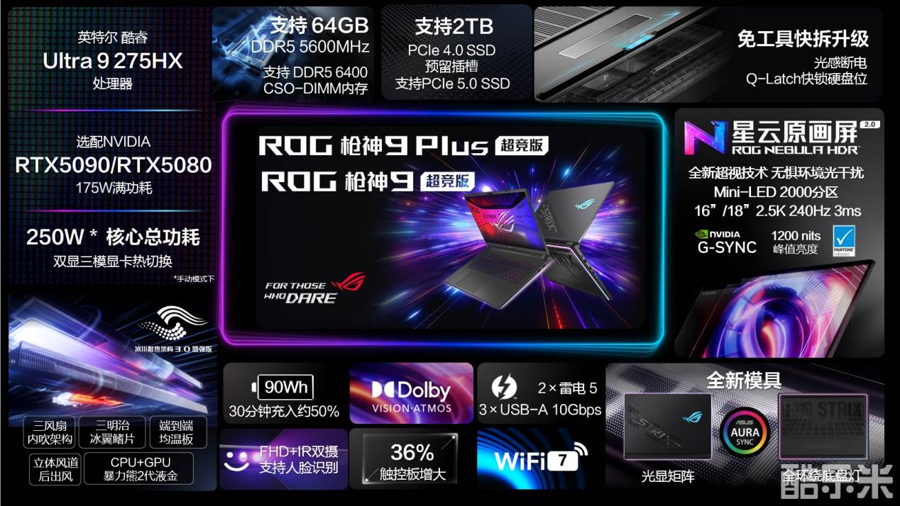 专为硬核电竞玩家打造的旗舰专业电竞本ROG枪神9系列在外观模具、核心配置、屏幕、散热、可扩展性多维度实现全方位升级。枪神9超竞系列搭载英特尔酷睿Ultra 9 275HX处理器+GeForce RTX 5090/5080笔记本电脑GPU。冰川散热架构3.0增强版拥有真空腔均温板以及暴力熊二代液金加持,结合三风扇内吹设计,核心总功耗可达250W。至高64GB DDR5内存+2TB PCIe 4.0疾速SSD,配合免工具快拆与光感断电设计,便捷升级更安全。