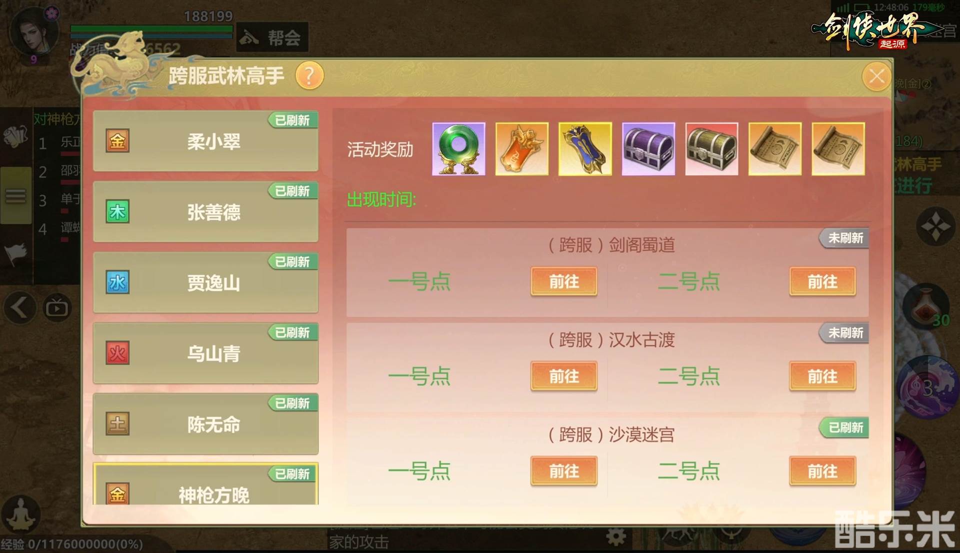 如今跨服武林高手横空出世,将这份战斗激情推向新的高度!服务器开启129级等级上限后,每周四晚,来自不同服的顶尖高手将齐聚一堂,为了荣耀和战利品展开殊死搏斗。五行相异的BOSS分布在华山、武夷山、嘉峪关等经典地图,柔小翠、张善德、贾逸山等十位武林高手各据一方,等待着大侠们的挑战。