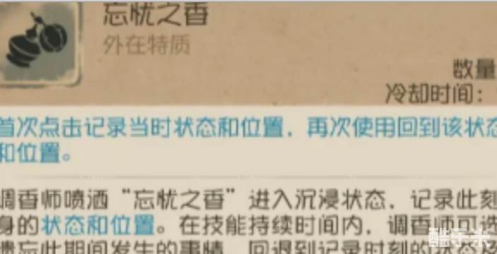 第五人格调香师是一位牵制类型的求生者,手持物是三瓶香水。点击使用技能香水后,调香师会洒香在原地留下当前的状态,再次点击技能,即可令自身回复到被留存的位置上,并且状态也会回到留存的那一刻。通过这个逻辑,可以初步了解到香水的使用方法,在监管者出刀前使用香水洒香,当被监管者击中再次点击技能回香,让半状态回复成为满状态。下面和酷乐米小编一起来看看吧