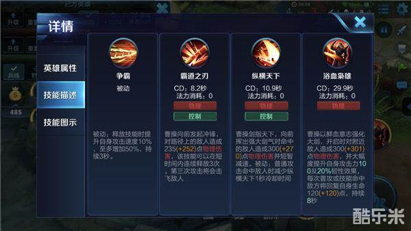 大招-浴血枭雄:曹操强化大剑,开启时对周围敌人造成物理伤害,并为自身提供高额的攻击力加成与韧性加成,每次普攻或技能命中敌人时,将会回复自身生命值,持续一定时间。