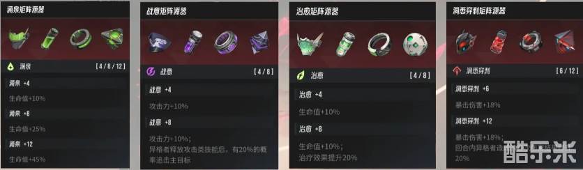 玩家们一共可以有15种矩阵的套装效果,攻势矩阵源器主要增加攻击力在输出方面非常有优势;涌泉矩阵源器主要是以增加生命值为主,而战意矩阵源器不仅可以增加攻击力,还有着额外的追击效果;治愈矩阵源器主要以增加生命值为主,并且还可以提升角色本身的治疗效果;洞悉穿刺矩阵源器则是增加暴击伤害。