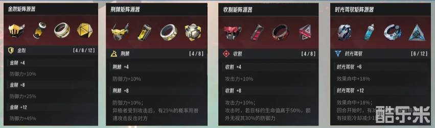 疾驰矩阵源器主要以增加速度值为主;金刚矩阵源器可以增加防御力;荆棘矩阵源器也是属于增加防御力的一种,并且它还可以存在一定的反击力;收割矩阵源器以攻击为主但有额外的优势效果,在敌方生命值高于50%时可以对其30%的防御力直接无视,时光驾驭矩阵元气是增加角色的命中效果,并且有额外效果,可以使角色所有的技能冷却减少一回合,但是只有35%的概率。