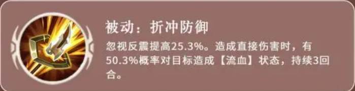 这个技能使用的时候,可以对敌方以及他左边和右边两个敌军的目标,一共3人造成攻击,攻击数值的话,基础的是有91%的数值,然后加上505的固定数值,那么这一次的伤害后期还可以提升35%的忽视效果,这里忽视的效果一般是针对于反震的,并且同时还有50%左右的概率,可以去驱散掉敌人身上的一些增益状态,不过驱散的数量不多,那么他在被动上面有一个折冲防御的效果,这个折冲防御也是针对于忽视反震的效果,触发的时候带来的效果是很不错的。