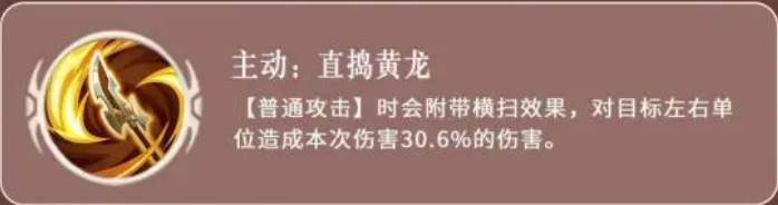 这里忽视反震概率会有提升,提升的数值达到了25%左右,如果是造成一些直接伤害的话,也就是说魏延他在攻击敌人造成了直接伤害的时候,会有50%的概率可以对这个目标再一次施加流血的状态,流血状态在敌人身上体现出来的就是掉落10%的攻击力,那么在持续3个回合的流血状态生成时间之内,大家也可以用到魏延的其他技能进行攻击,他的主动技能叫做直捣黄龙,使用这个技能的时候会附带一定的横扫效果,这个横扫效果是使用普攻的时候可以额外带来的,此时会对一个敌人周边,也就是左右两个角色带来本次伤害的一个额外的附加伤害,这一次附加伤害百分比不高,只有30%,但是毕竟是普攻之外的追加伤害,所以也可以当做是一个连招后面的小招式使用。
