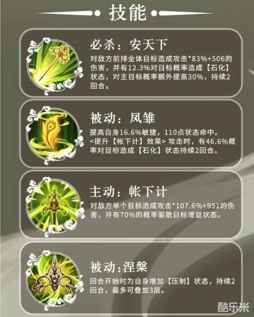 【定位】群体控制型武将,也是速度最快的控制武将之一。