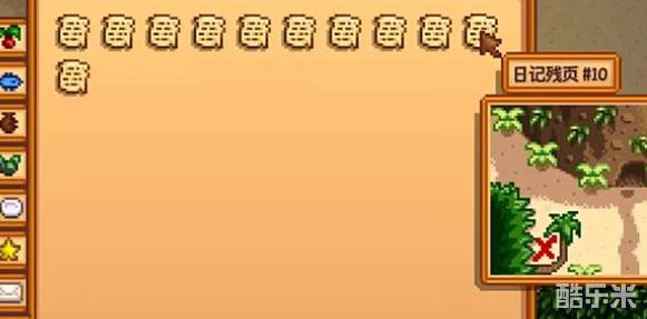 记残页10是11张日记残页之一,其核心线索指向火山入口外的藏宝点。这张残页需在姜岛通过除草、挖矿等探索活动随机获取,下面和酷乐米小编一起来看看吧