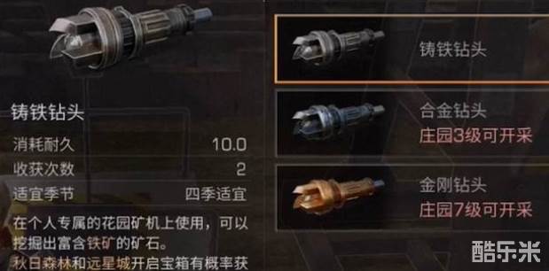 明日之后商城购买、秋日森林开僵尸宝箱或高级地图挖矿概率掉落。启动后,每次采矿消耗2点挖掘机耐久度,同时需要消耗钻头耐久,耐久耗尽后需更换新钻头。