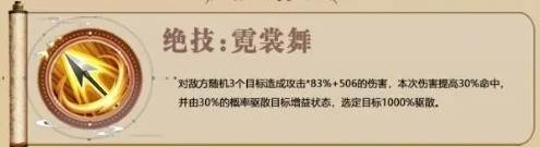 出场或施放【霓裳舞]时,为自身和己方随机2个目标添加【伤害减免提升】状态,持续3回合。【伤害减免提升】:伤害减免提升28.6%