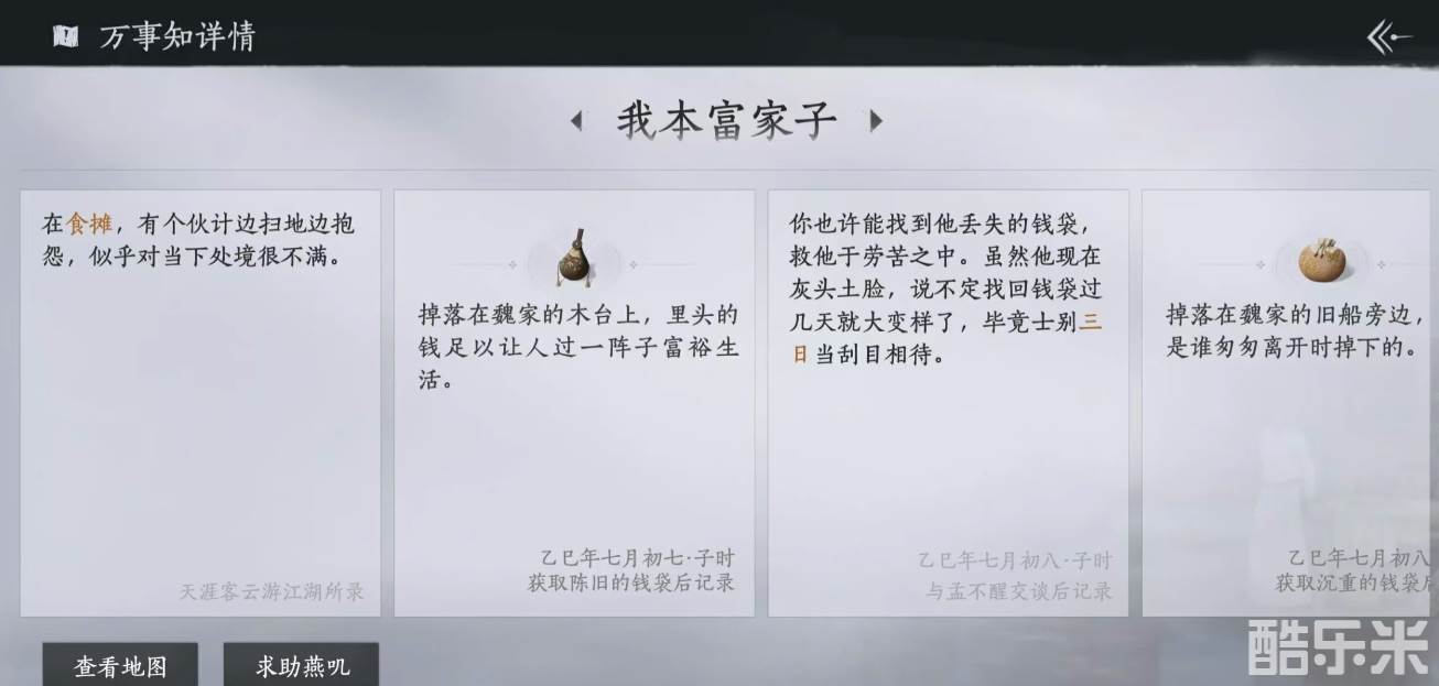 两天后再次和孟不醒交谈,就能达成多个不同的结局。这里如果交付的是过于沉重的钱袋,那孟不醒会成为踏实做事的有用之人。若交付的是陈旧的钱袋,那孟不醒会因为耽于享乐而慢慢失去财富。