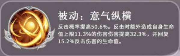 被动叫做意气纵横,这个技能就是跟反击效果有关的,被动效果触发的时候,他在反击的概率上面会提升50%的数值,所以在他使用反击的时候,还会额外造成生命上限11%左右的伤害数值,这里的伤害数值还可以额外再提升32%左右的效果,这是给自身带来的恢复效果,会根据他的反击伤害带来15%左右的数值恢复,他的这个恢复数值就根据他的反击效果来判定,所以大家用他的这个反击效果越厉害的同时,他自身恢复的生命数值百分比就越高。