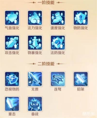 坐骑技能共6个,最多自选5个技能,每个技能等级上限5级,技能效果受等级影响。技能详细说明:/前后分别为1-5级技能效果攻击强化(5⭐):攻击力提高(2%|4%|6%|8%)暴击强化(5⭐):物理暴击率提升(2%|4%|6%|8%)速度强化(5⭐):速度提升(2%|4%|6%|8%|)物防强化(4⭐):物理防御提高(200|400|600|800)法力强化(3⭐):法力上限提高(2%|4%|6%|8%)气血强化(3⭐):气血上限提高(2%|4%|6%|8%)忽视物防(5⭐):造成物理伤害忽视防御(2%|4%|6%|8%)奋战(4⭐):每次造成伤害后提高19.20(灵兽等级x技能等级x0.2)攻击力,最高可叠加10层(随等级提升)无畏(4⭐):对气血高于自身的单位造成伤害增加(10%|20%|30%|40%)连弩(4⭐):造成伤害有概率额外连击(1次|2次)重击(4⭐):每段普通攻击造成伤害提升(10%|20%|30%|40%)招架(3⭐):受到伤害有概率减少50%伤害(2%|4%|6%|8%)