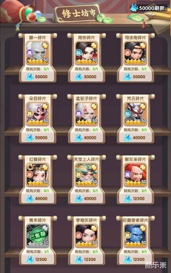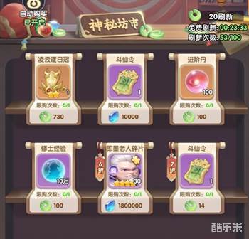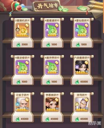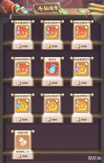 斗气坊市:主要来源群仙夺魁。这里看你主买个阵容,主要换看神品碎片差多少,不够50碎片,就换名仙令。