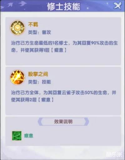 云雀子的定位是辅助,拥有超强的连续群体治疗能力与回怒能力,技能提高队友输出,又能保障队伍续航能力,是新老手必备的核心修士。