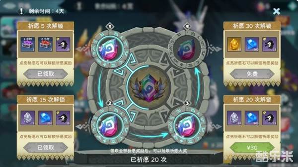 ②祈愿有礼:点亮祈愿石后可领取丰富奖励(高级召唤石、基础召唤石、资源包、精英龙碎片等等),需按序领取,领取全部祈愿石后,可以抽取祈愿大奖