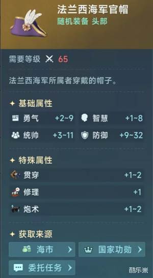 海军官帽,这个65装备获取难度还是比较大的,他需要国家3级后才能使用国家功勋才能购买,属于收藏价值大于使用价值,不推荐升星。