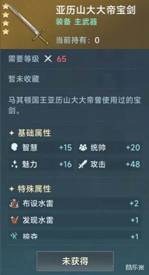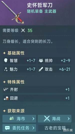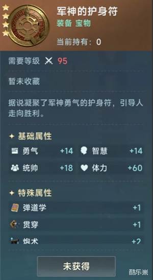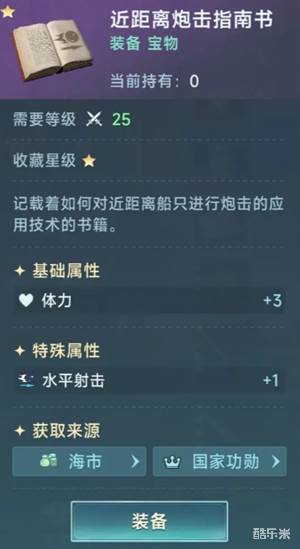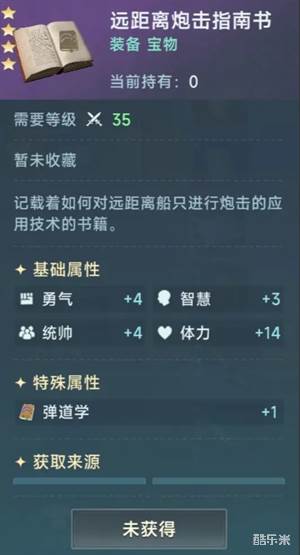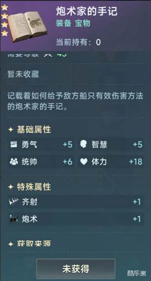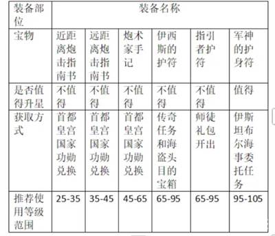 宝物是所有装备里面最麻烦的,获取难度都很大,只有军神的护身符可以在海事委托任务获得,但是这个又是95的毕业装备,所以导致前期经常会不知道用什么宝物。如果一定要选一个的话,推荐炮术家手记,加的技能最好。
