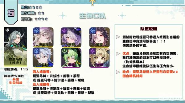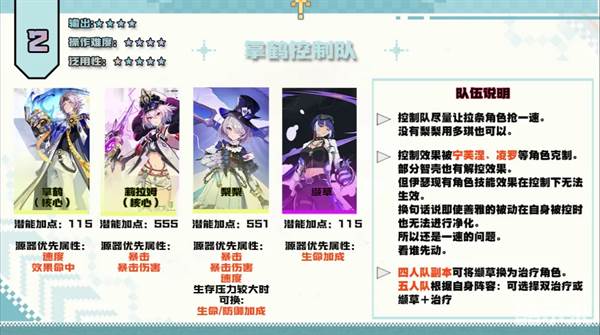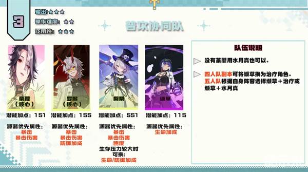 部分高难本可将梨梨换治疗,保证血线。如果没有ssr治疗角色,比较推荐的是千明,根据目标生命上限治疗(多乐丝太脆了,很容易被秒或控)。
