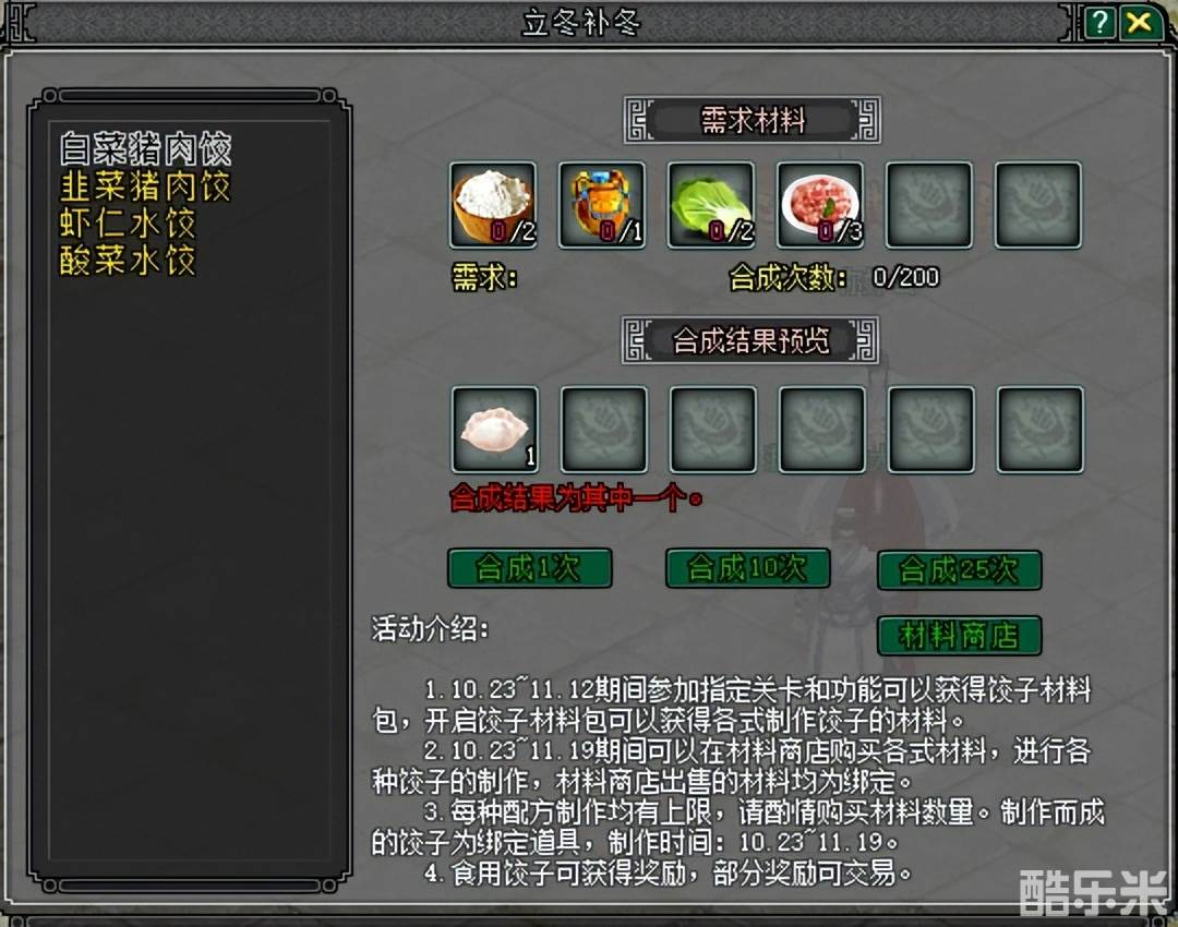 立冬补冬:包饺子吃福利,白菜饺、虾仁饺、酸菜饺任选,可选“2.5倍经验”模式,灵活培养!。