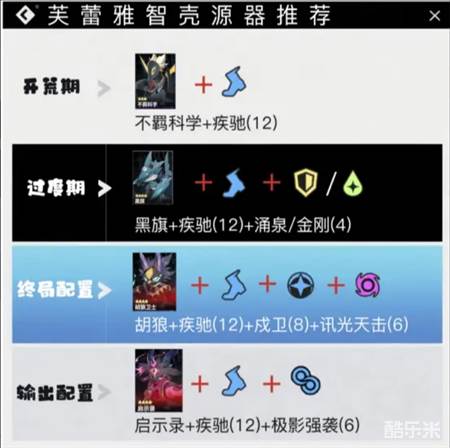为大家制作了一图流智壳源器推荐,12疾驰是必须的,后期有2种玩法一种是辅助高速增益队友,一种是启示录多段输出高速打速攻。这个版本由于启示录在pvp中被削弱所以推荐玩高速胡狼辅助流就好。