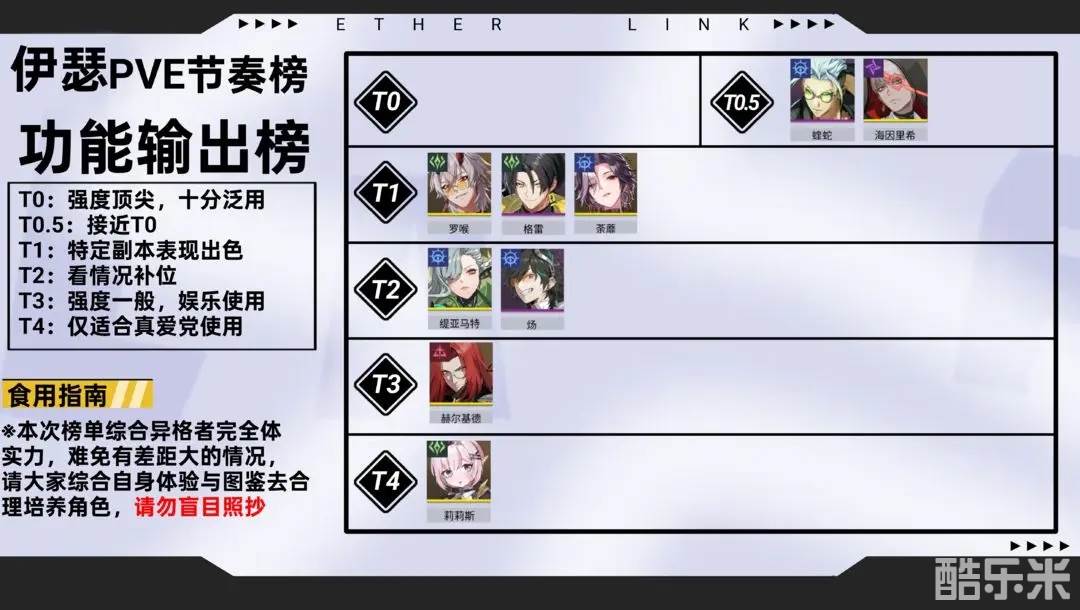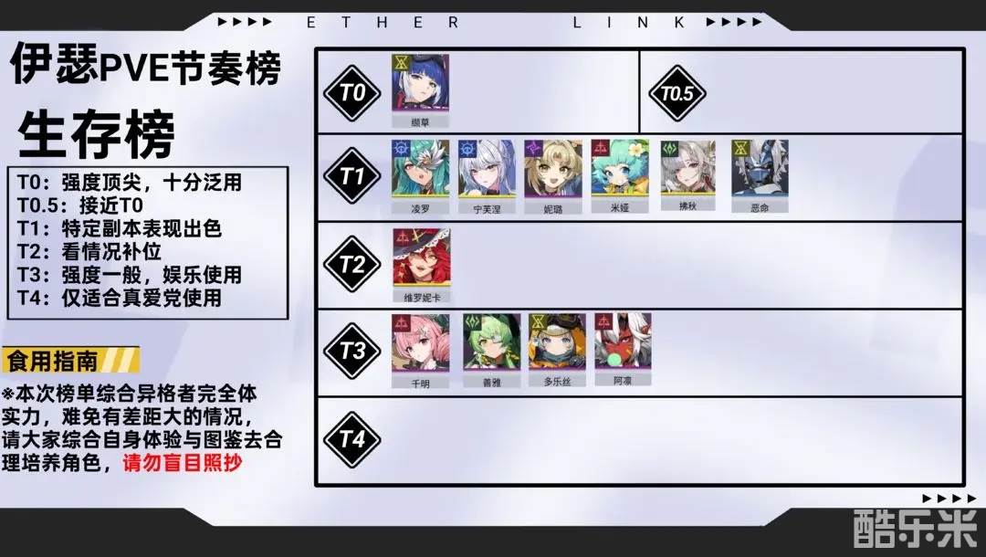 伊瑟游戏里角色强度各有差异,对于分享的PVE节奏榜仅供参考,实际强度可能因个人喜好和游戏版本的不同而有所差异。建议根据自己的实际情况和体验来选择适合的角色进行培养。以下是榜单图鉴分享。