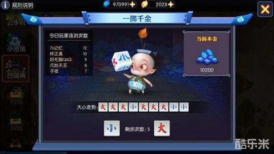 听说游戏里有个小屁孩儿,名唤叽里咕噜。小小年纪,一粒骰子走天下,听说凡是遇见他的人最后都发财了!每触发一次一掷千金最多有5次机会和叽里咕噜猜大小,首次猜大小时候有本金,每猜对一次就能获得翻倍奖励,猜错则结束一掷千金。