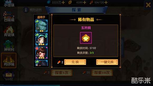 每次探索除了可以获得天赋升级材料和灵石外,还能触发三种随机事件:稀有材料兑换、一掷千金、神秘商店。偷偷告诉你,每探索10次必有一次机会可以获得稀有材料的兑换机会哦!