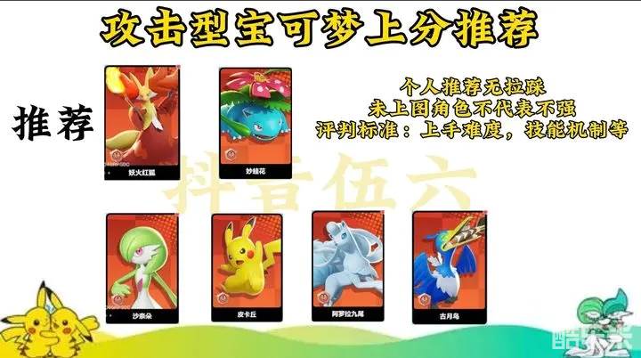 攻击型宝可梦上分推荐,我个人比较偏向于简单操作,控制,跑得快类型的角色,所以我个人推荐妖火红狐和妙蛙花这两个.