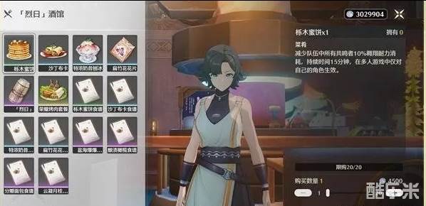 可购买菜肴:栎木蜜饼、沙丁布卡、特浓奶昔刨冰、扁竹花花片、烈日、荣耀烤肉套餐。