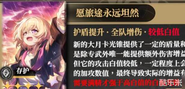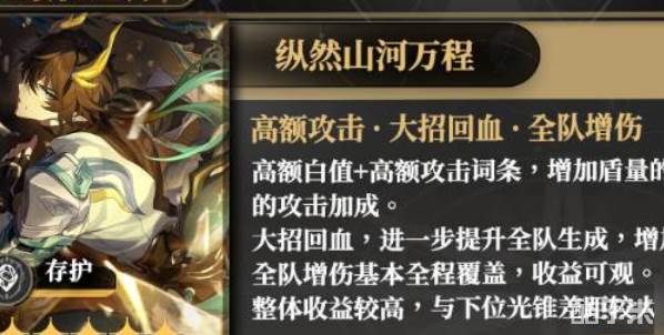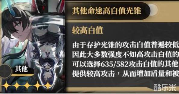 由于存护光锥的攻击白值普遍较低,且被动不加攻击。因此大多数强度不如高攻击白值的白板光锥。可以选择635/582攻击白值的其他命途光锥。提供较高攻击,从而增加盾量和被动加攻。
